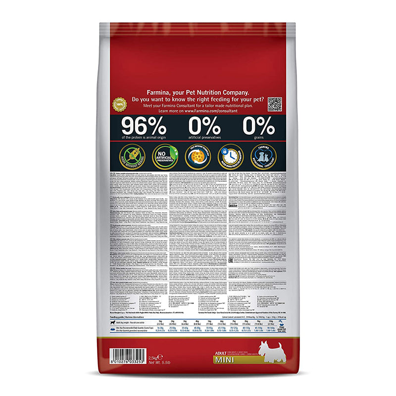 Food Type: Dry dog food Suitable adult dogs of mini breeds Chicken, Pumpkin & Pomegranate Grain-free and Gluten-free Free from Genetically Modified Organisms (GMO) No artificial preservatives Cruelty free research Consult a vet before altering your pet's diet Always have fresh water available for your pet Never exceed recommended feeding quantities unless prescribed by a vet.